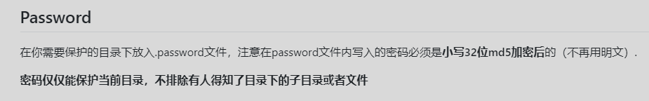 Oh buddy, I have added the feature of protecting directory by password before, but what makes it different is that you need to convert your password to lowercase 32-bit md5 and write it in a .password file which is put under the directory you're willing to protect.